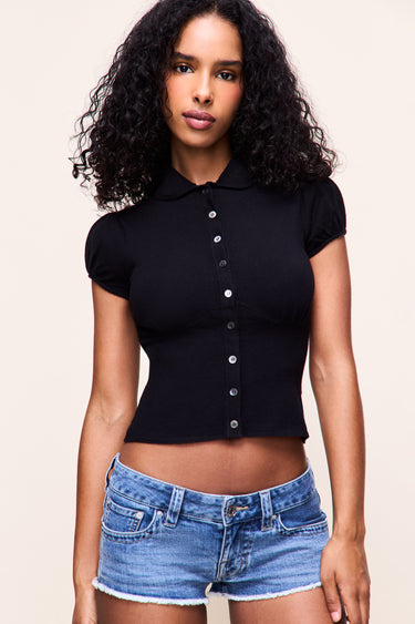- The Liana Knit Top is designed in a soft, body-hugging knit with a delicate collar and full button-front closure. Finished with subtle bust shaping and short sleeves for a flattering, feminine silhouette.