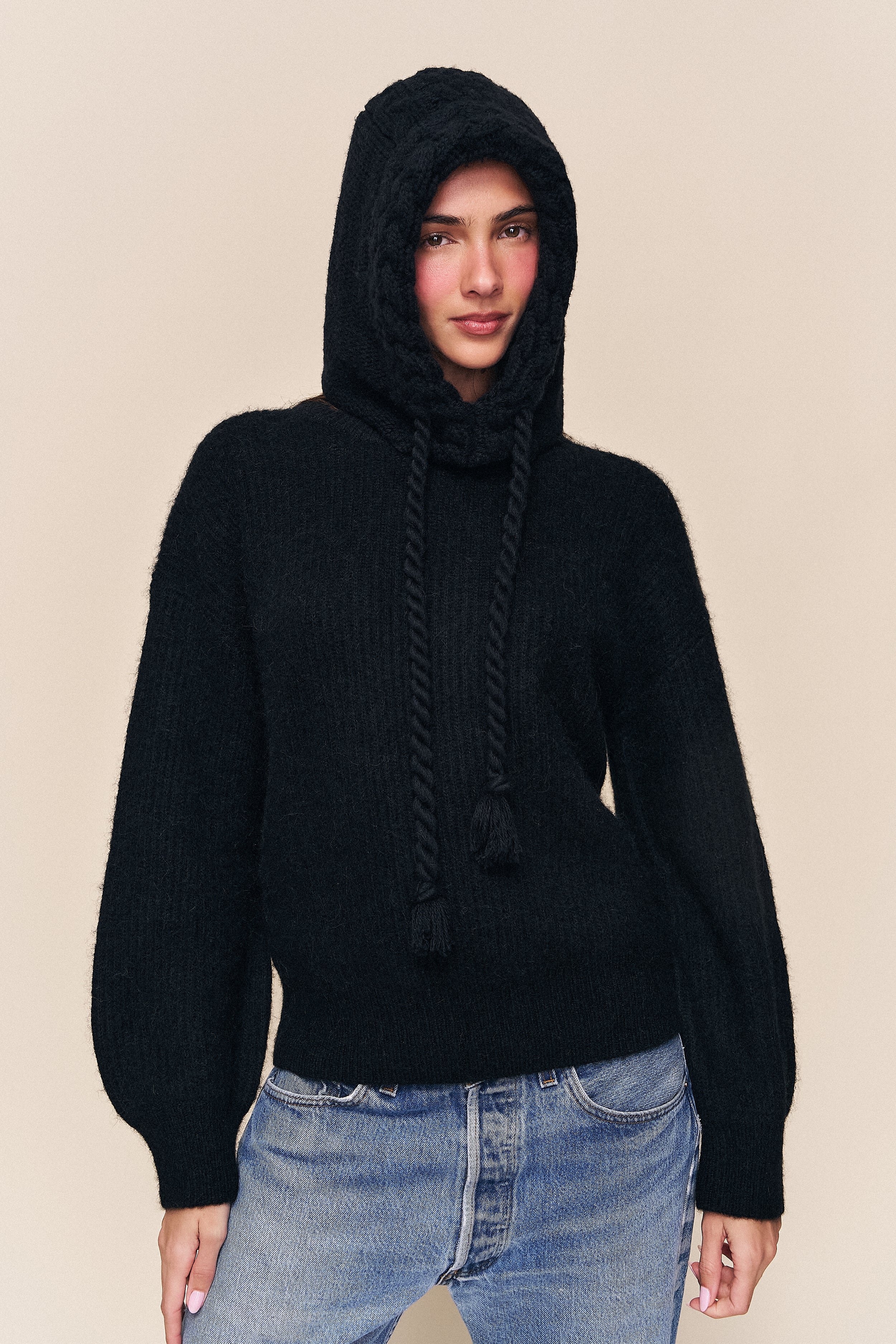 - A cloud-soft cable-knit hood with braided ties and a cozy, face-framing fit. Cold-weather comfort, elevated.