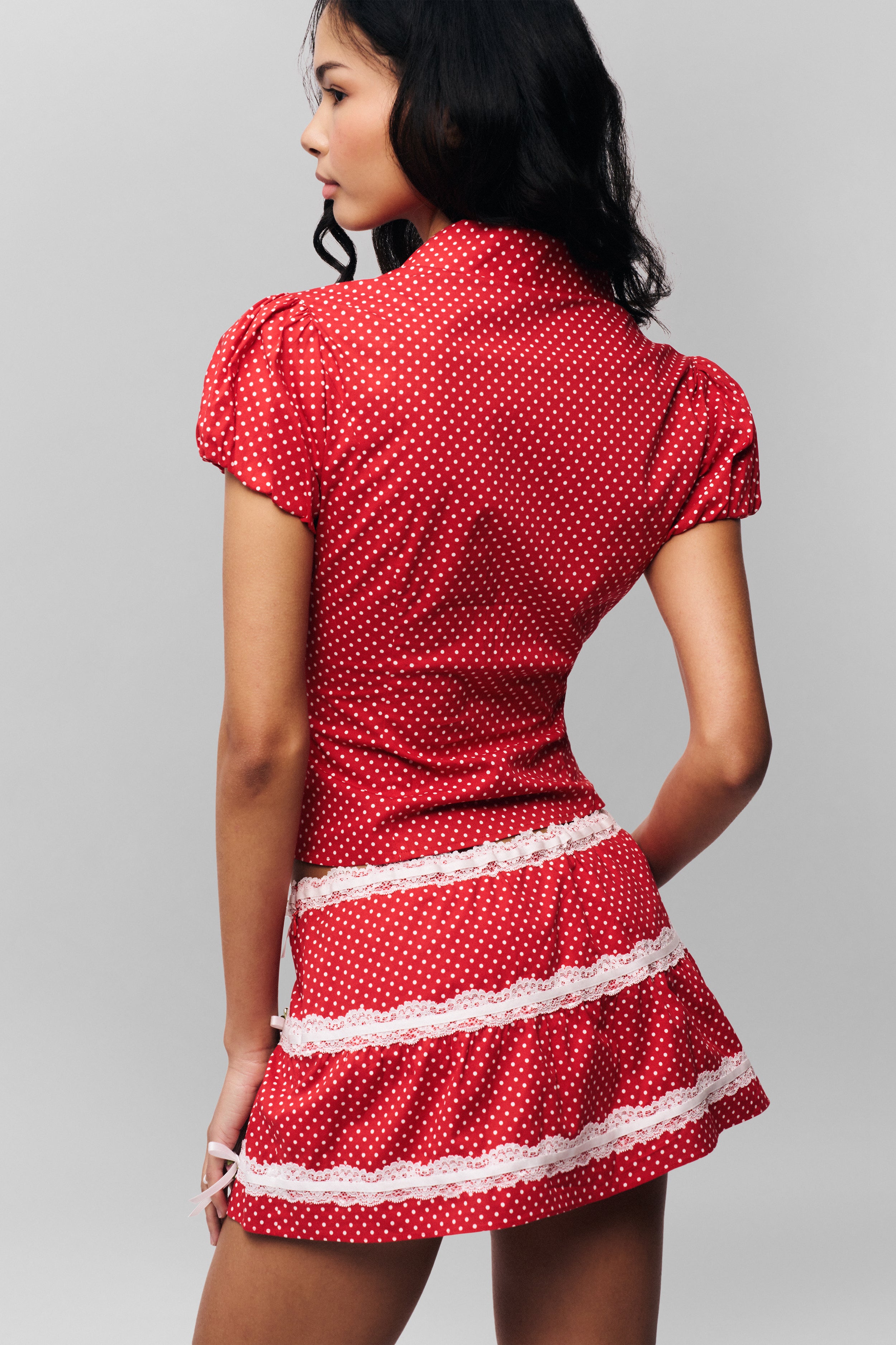- Introducing the Simone Mini Skirt - paired perfectly with our Liana Top. Features side bows, lace details, and a zipper closure.