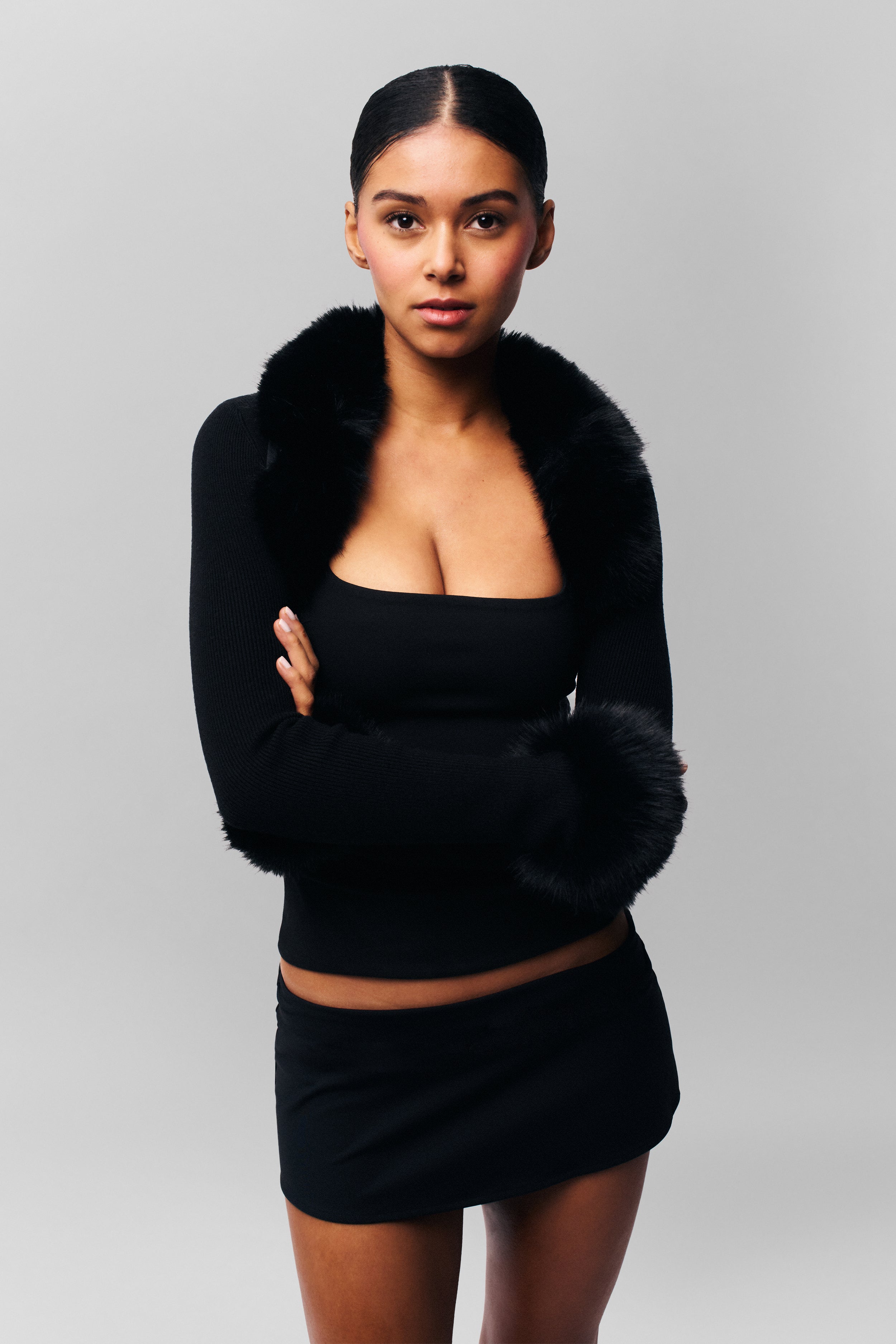 - Keep it cozy with our Faux Fur Knit Bolero. Designed to coordinate with our Knitted Corset, the plush faux fur trim can be removed for a more casual finish, but we love it for the maximized look.