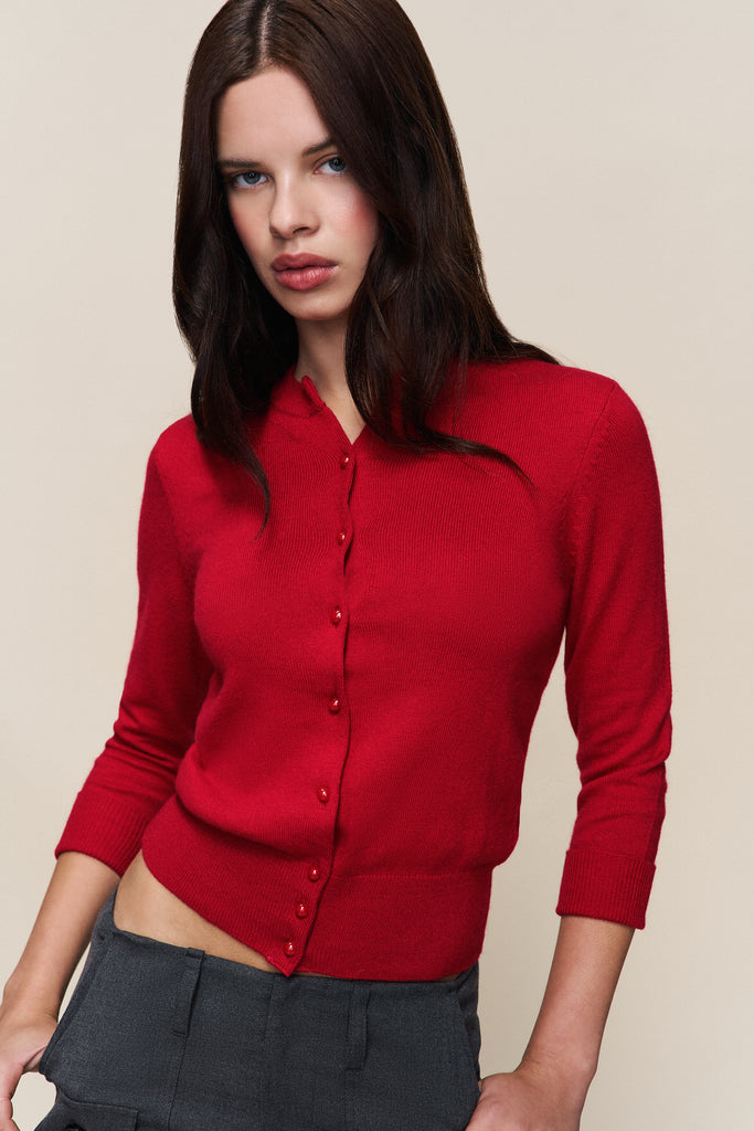 - Button-down cropped cardigan that sits right above the hip. Sleeves features a nice fold-over detail.