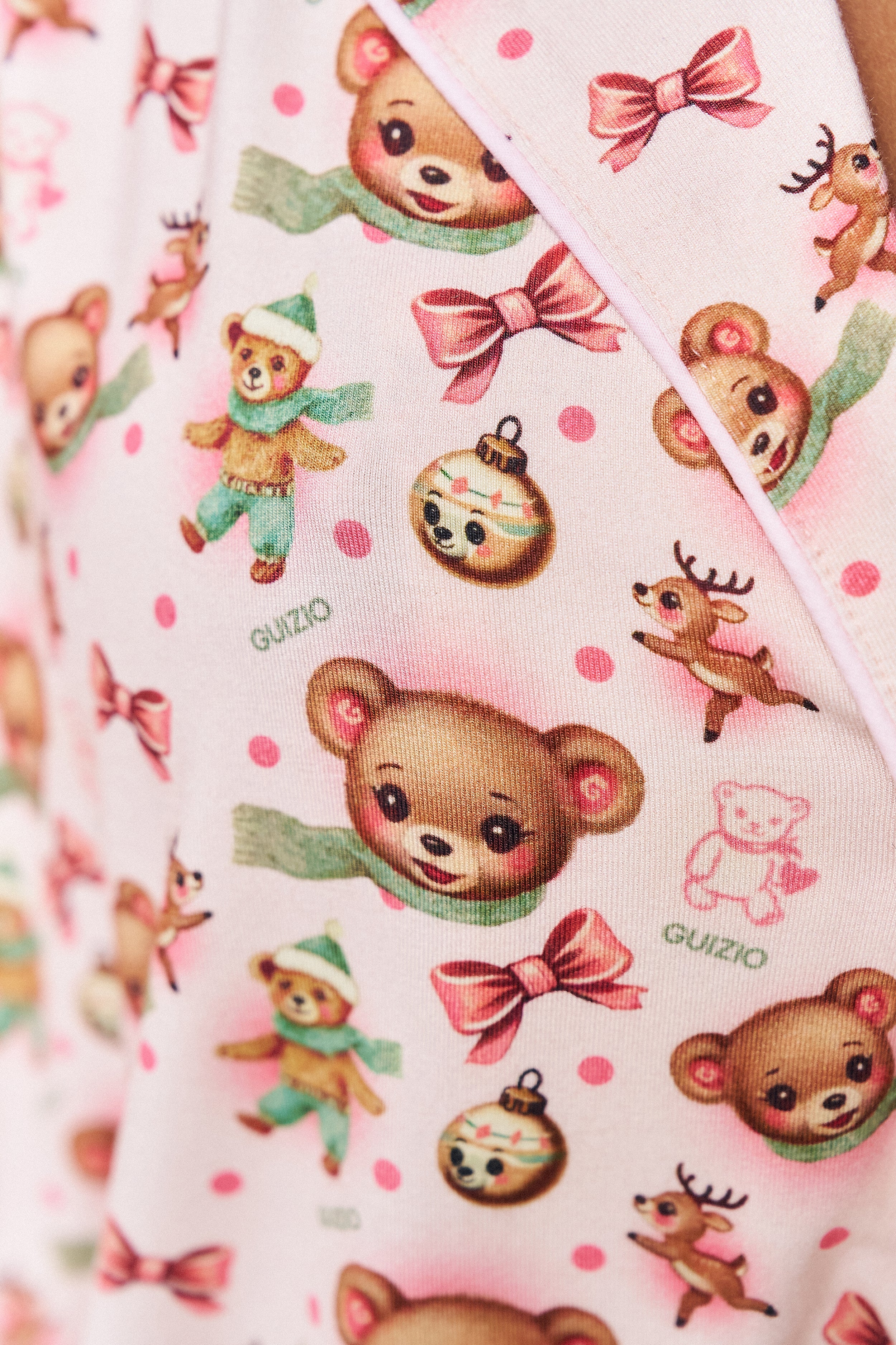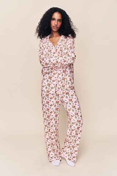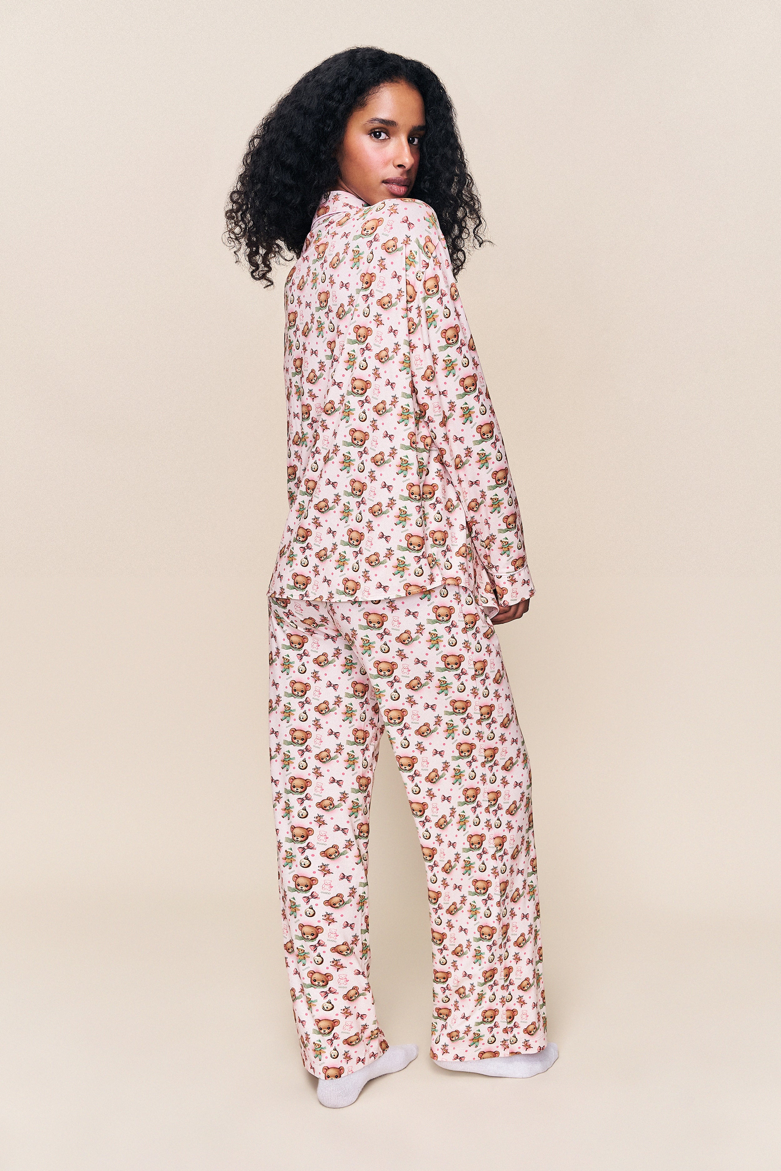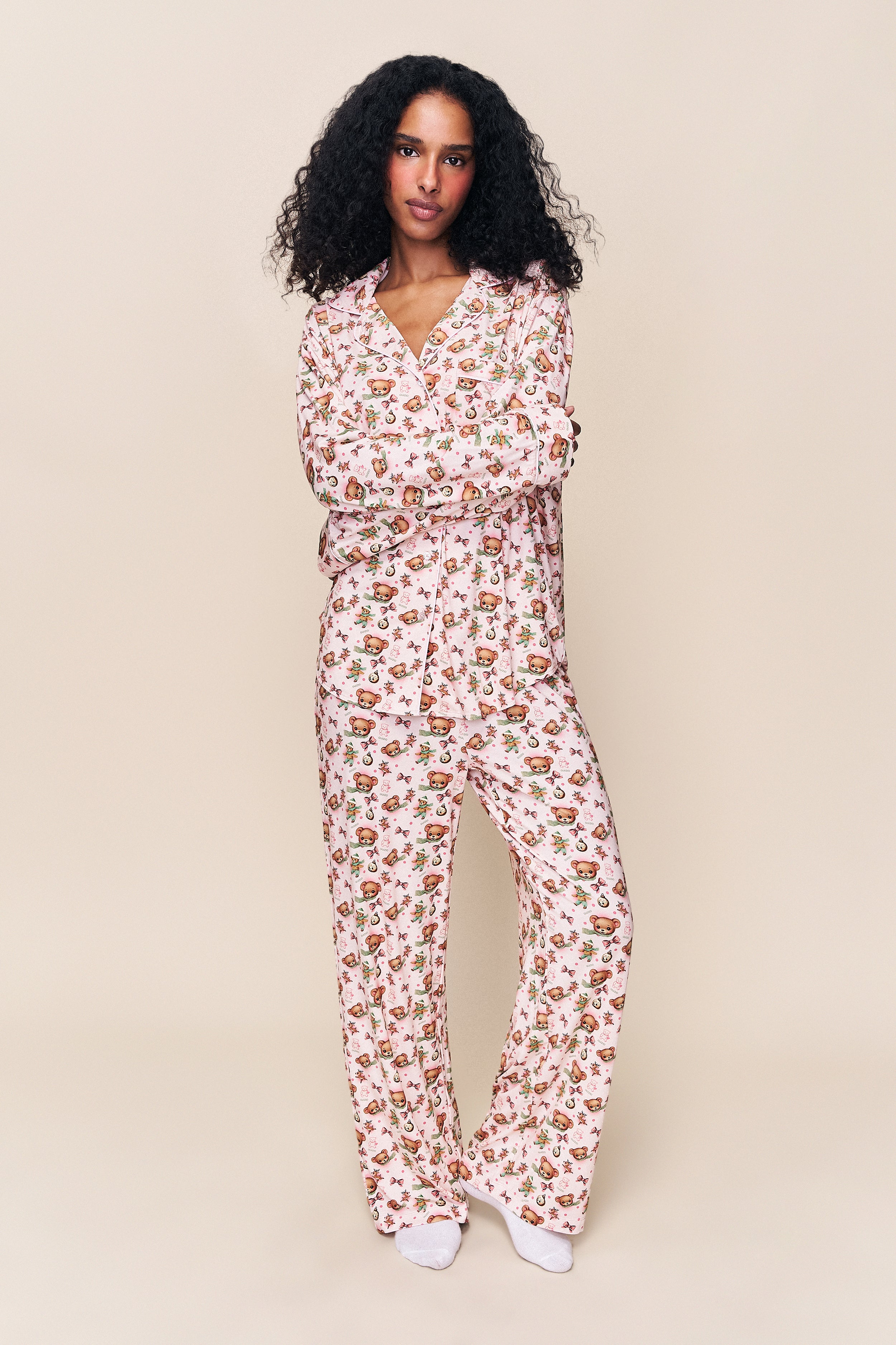 - Cozy up in the Ella Set, featuring our limited-edition Guizio bear print on an ultra-soft, relaxed two-piece silhouette. The button-down top and wide-leg pant make it perfect for slow mornings and holiday lounging.