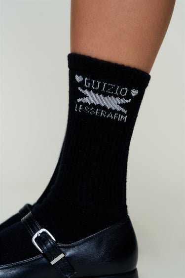 • The Calf Socks bring a playful finishing touch to the Guizio x Le Sserafim collaboration. Knit in soft, breathable cotton with a ribbed structure, the pair is embroidered with the collab lock-up and subtle heart motifs. Designed to hit mid-calf, they’re the versatile accessory that ties the capsule together—whether styled with loafers, Mary Janes, or sneakers.