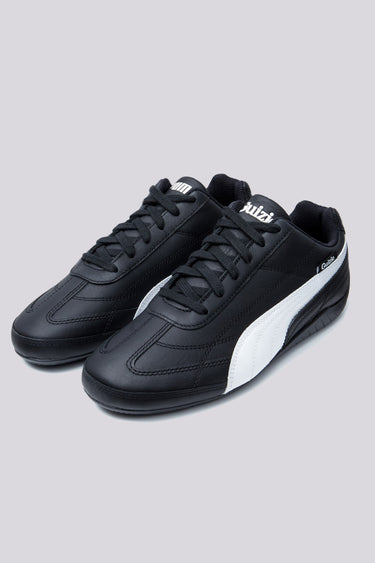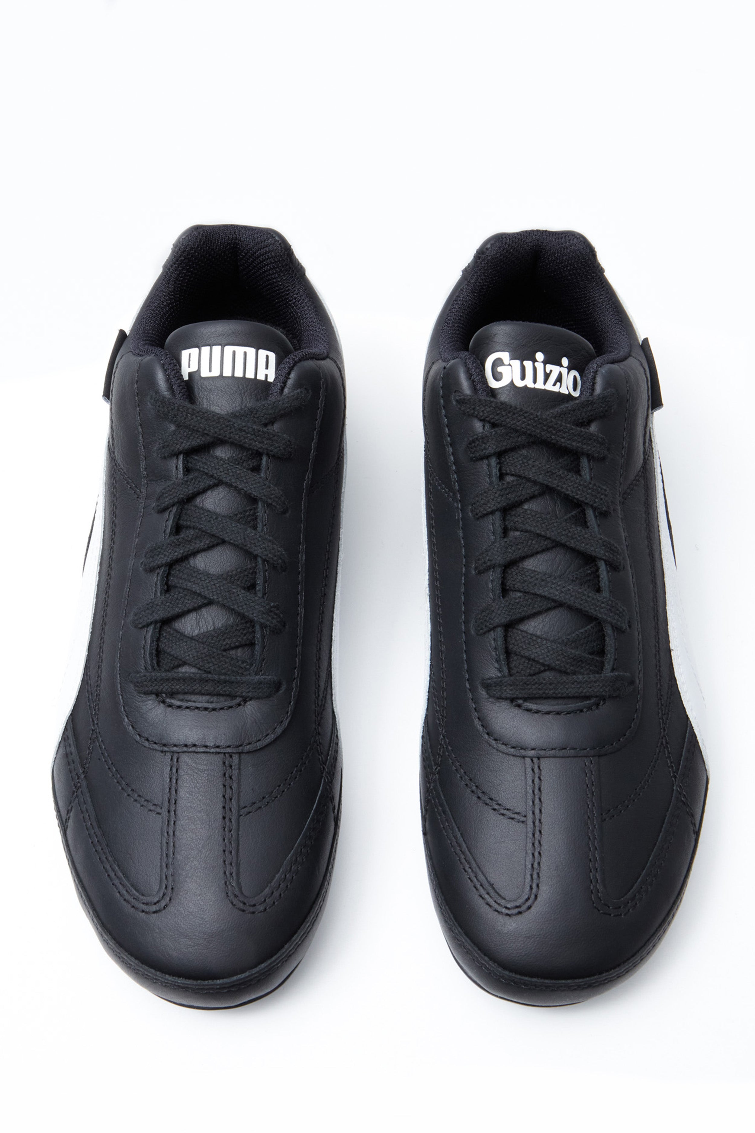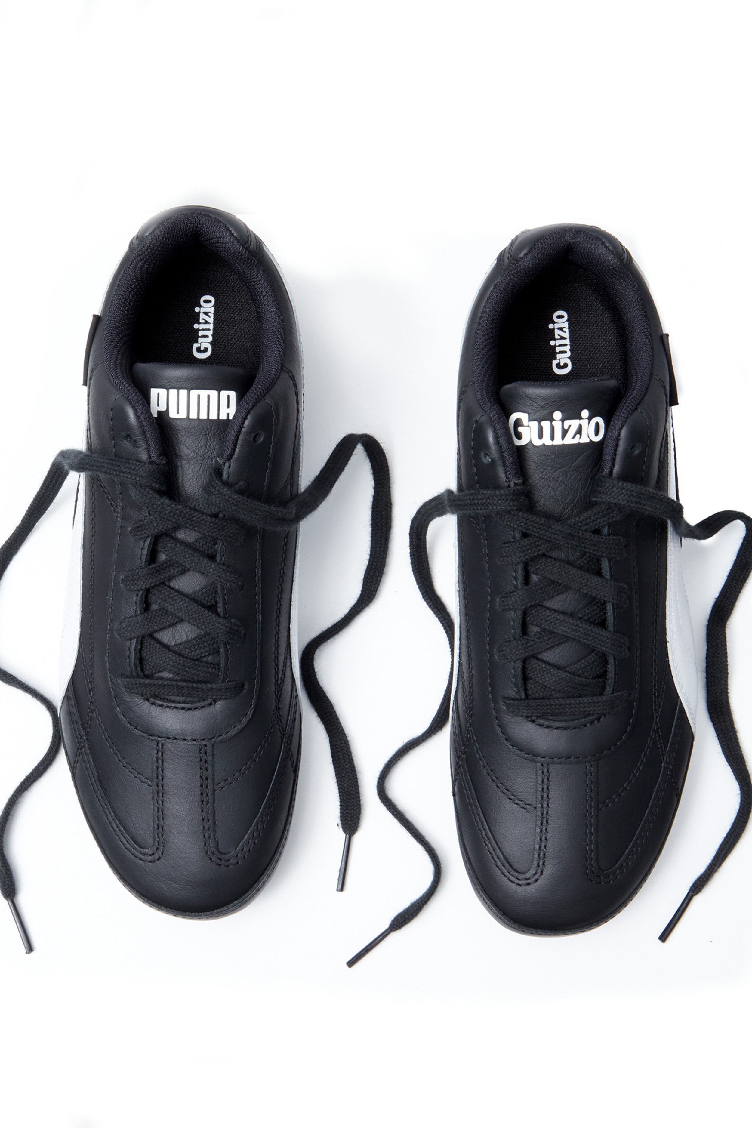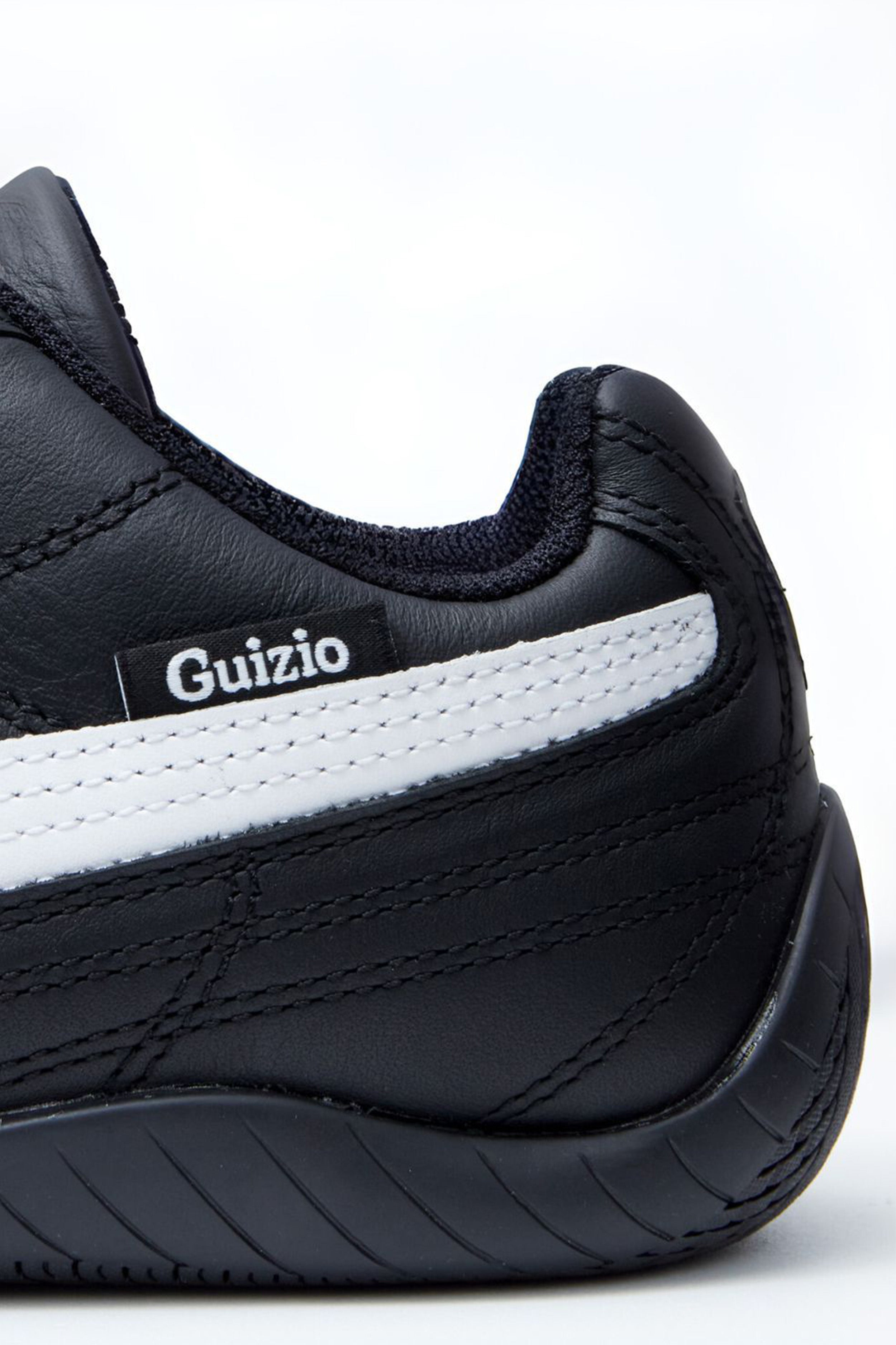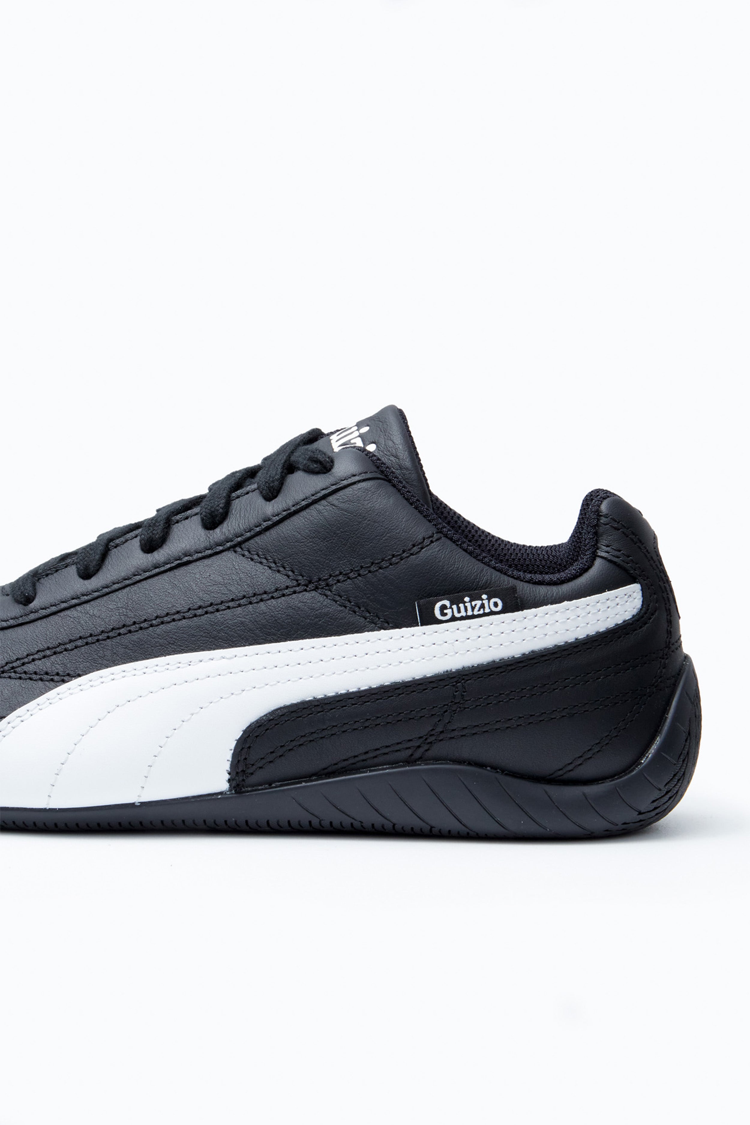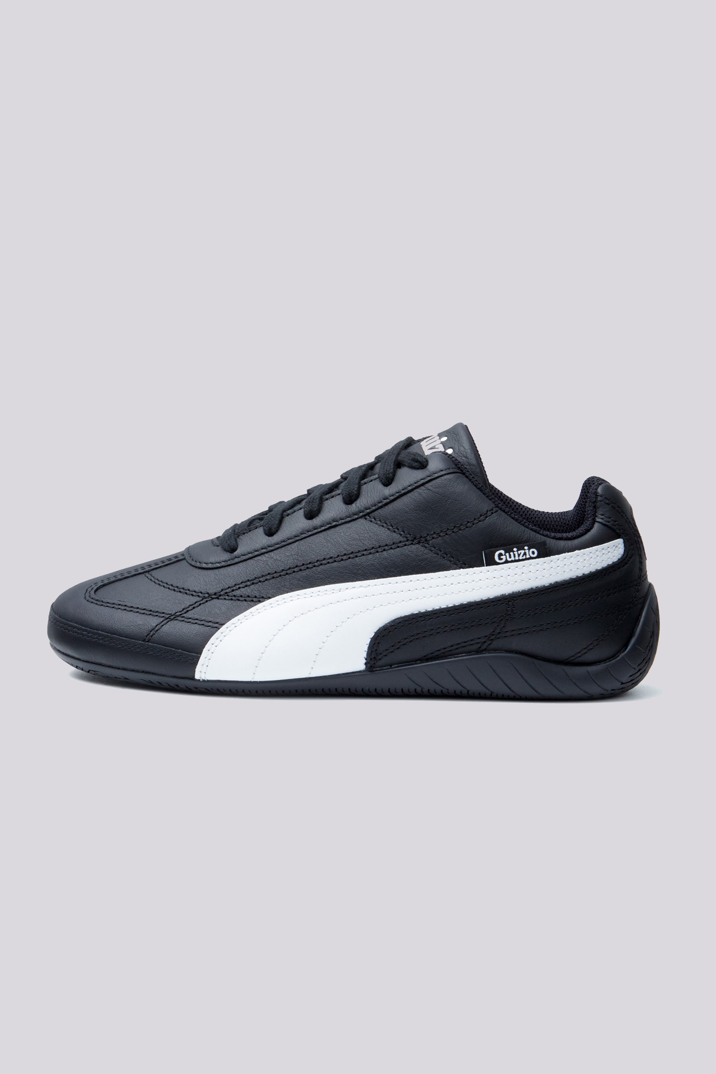 - The Guizio Speedcat in Black combines classic Puma motorsport style with elevated design elements by Guizio. Featuring a premium leather upper with an all-over stitched pattern, this shoe brings texture and sophistication. The Puma formstrip adds signature branding, while the Guizio woven label tag highlights the collaboration. Finished with a tire tread-inspired outsole, the Speedcat offers both traction and a nod to its motorsport heritage, making it a sleek option for fans of classic style with a modern edge.