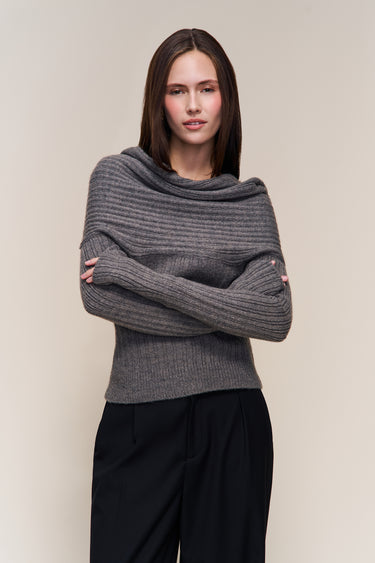- Designed with versatility in mind, the Loretta Top features a wide ribbed fold-over neckline that can be styled off-the-shoulder or as a soft cowl. Crafted in a cozy wool-blend knit with elongated sleeves and a fitted silhouette that flatters the form. Elevated yet effortless—the perfect transitional layer from day to night.