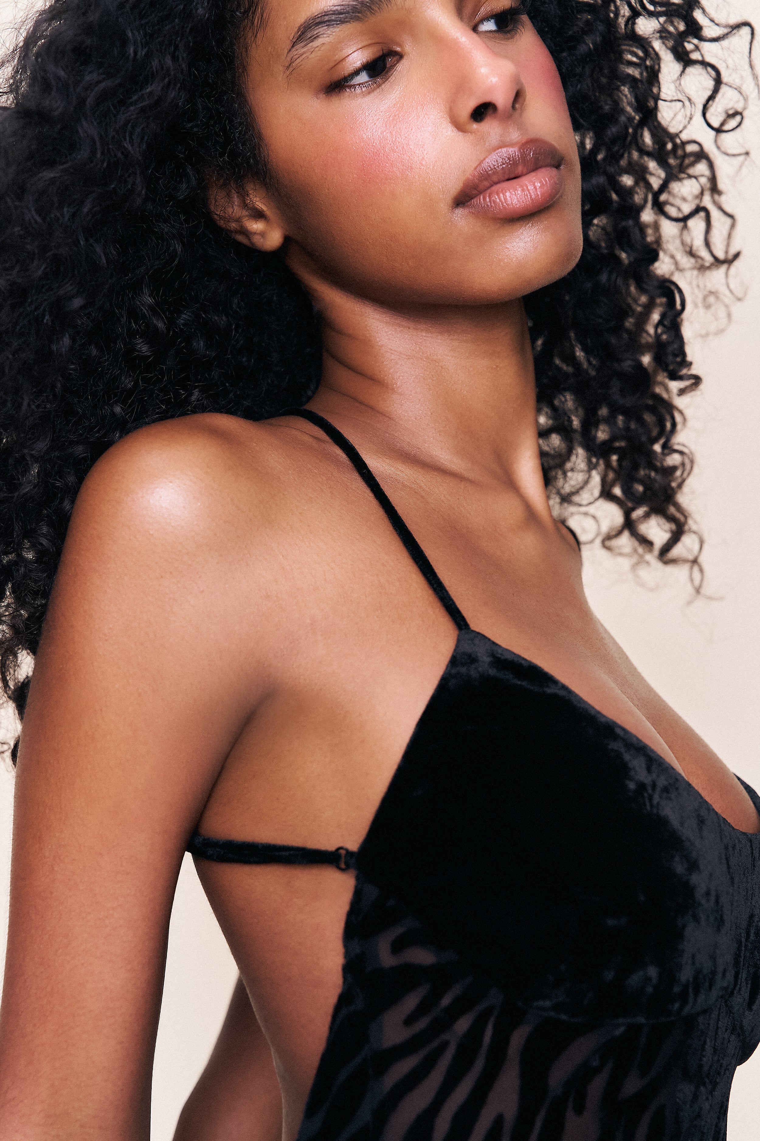 - The Violette Maxi Dress crafted in a burnout velvet with a tonal zebra pattern, this sheer silhouette hugs the body before falling effortlessly to the floor. A velvet bust adds texture and dimension, while delicate crisscross straps frame an open back for a striking finish.