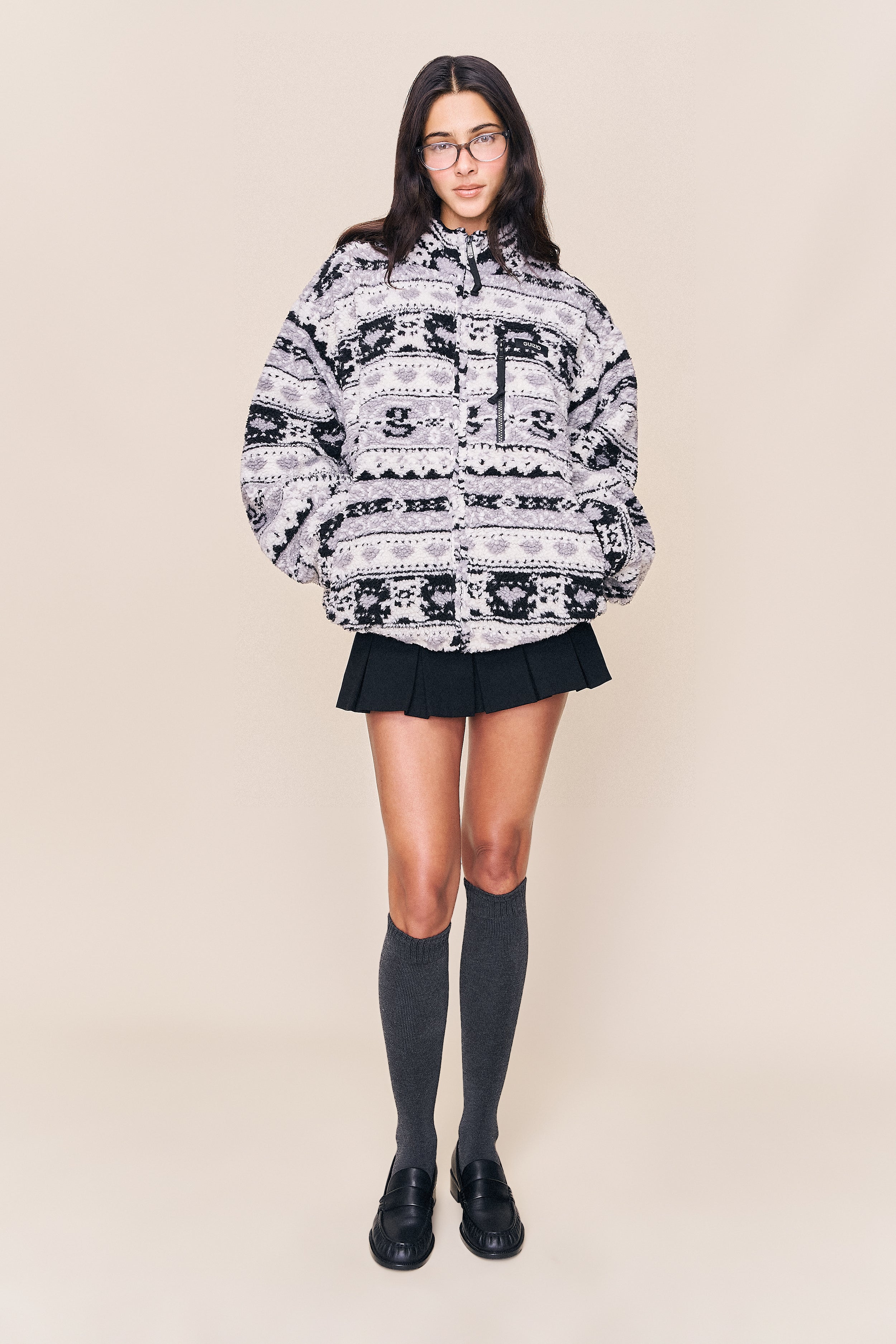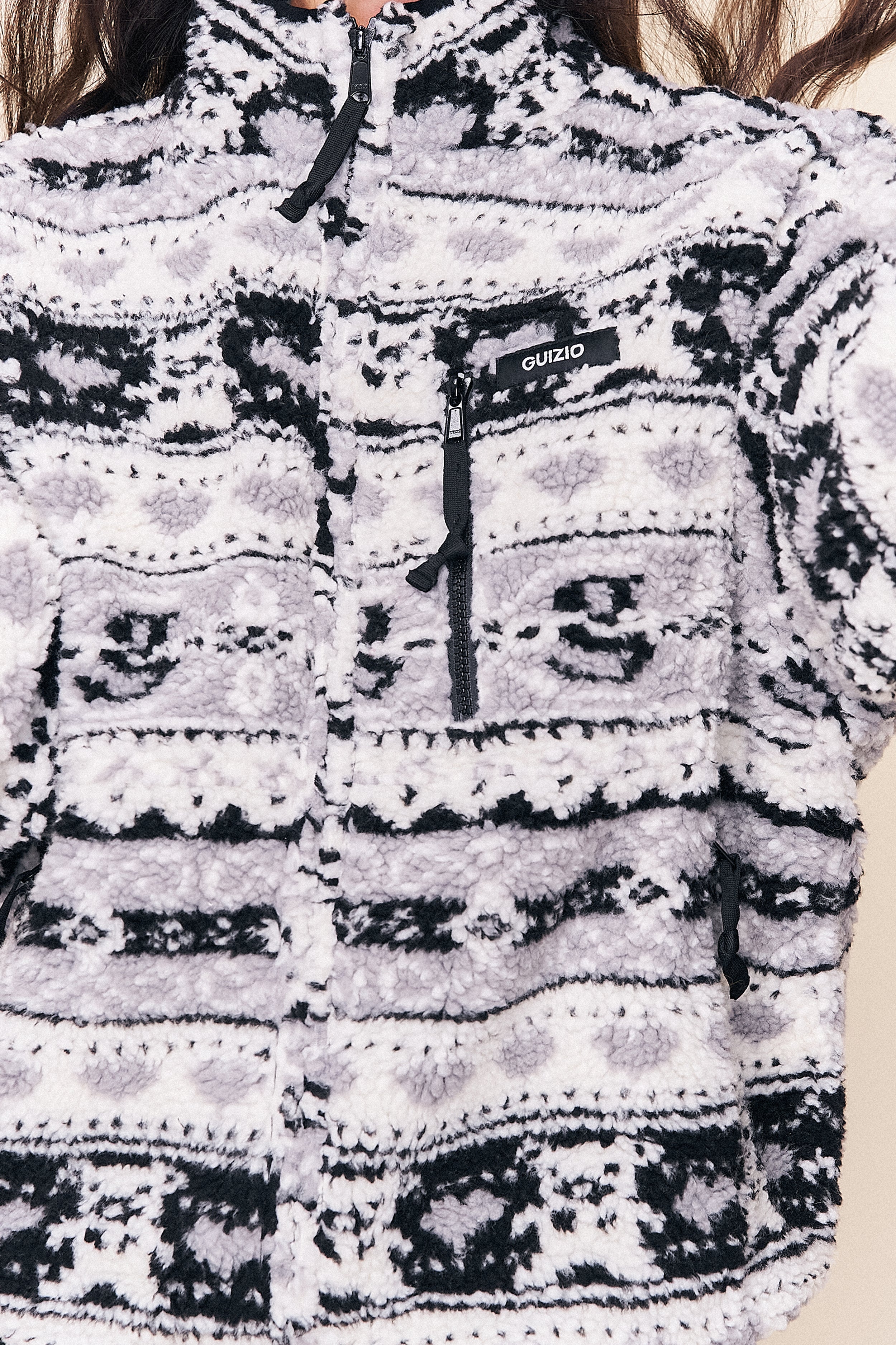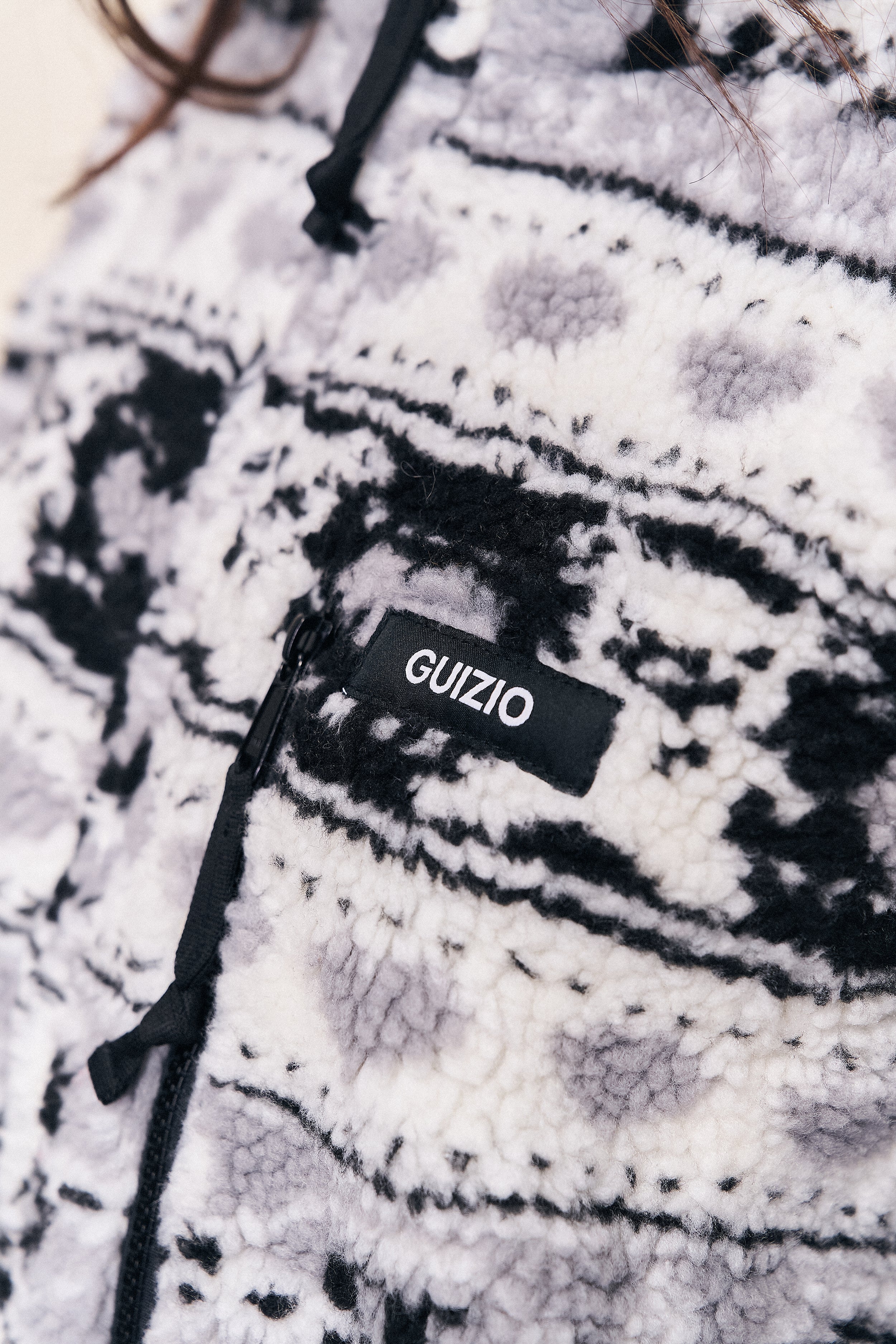 - An elevated take on everyday comfort. The Guizio Sherpa Zip Up Jacket features plush animal-print fleece with contrast nylon detailing and functional zip pockets. Designed with an oversized fit that layers effortlessly.