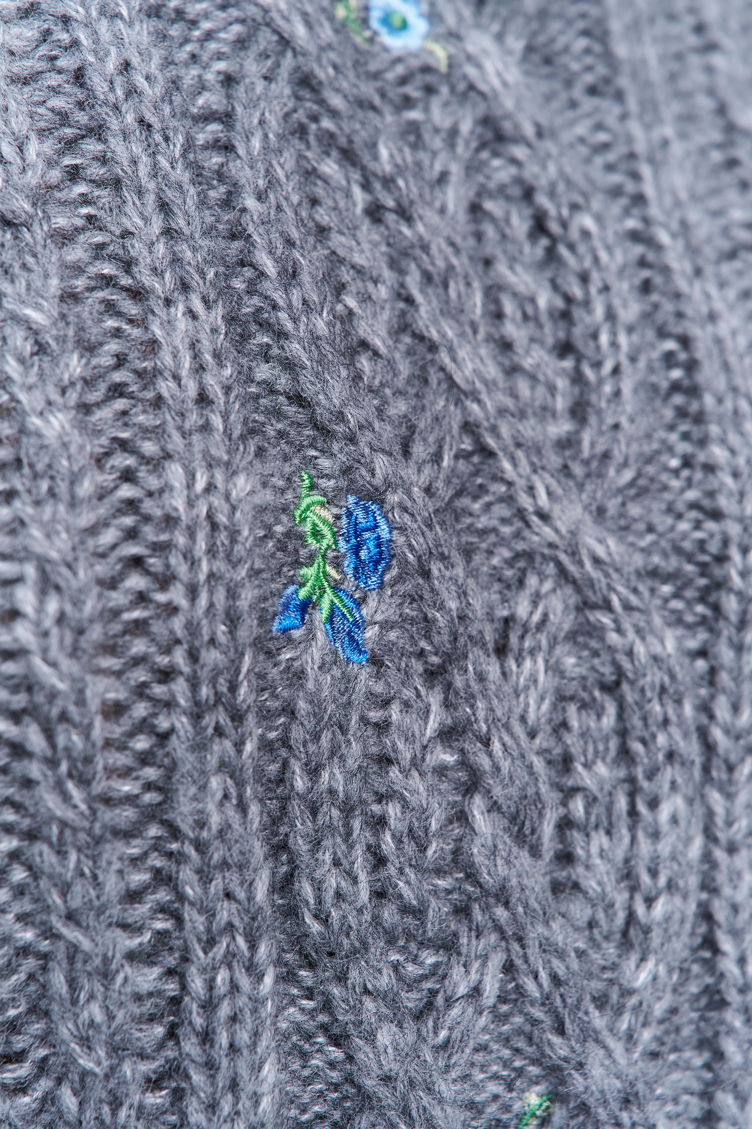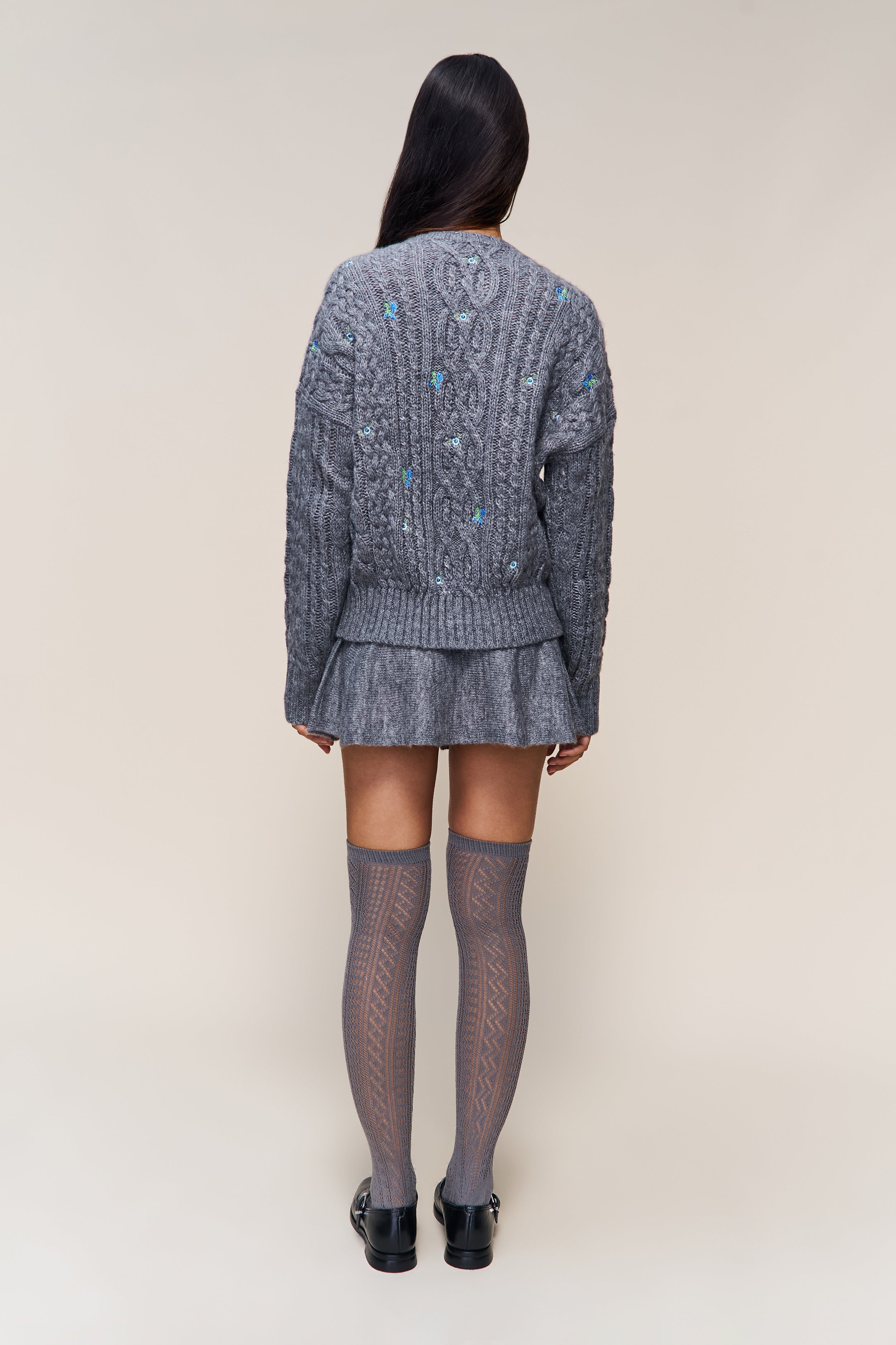 • A cozy take on classic knitwear. The Etta Sweater is crafted from a soft wool blend featuring cable knit detailing throughout and delicate embroidered floral accents. Designed for a relaxed fit that drapes effortlessly on the body—pair it with the matching mini for an understated yet romantic look.