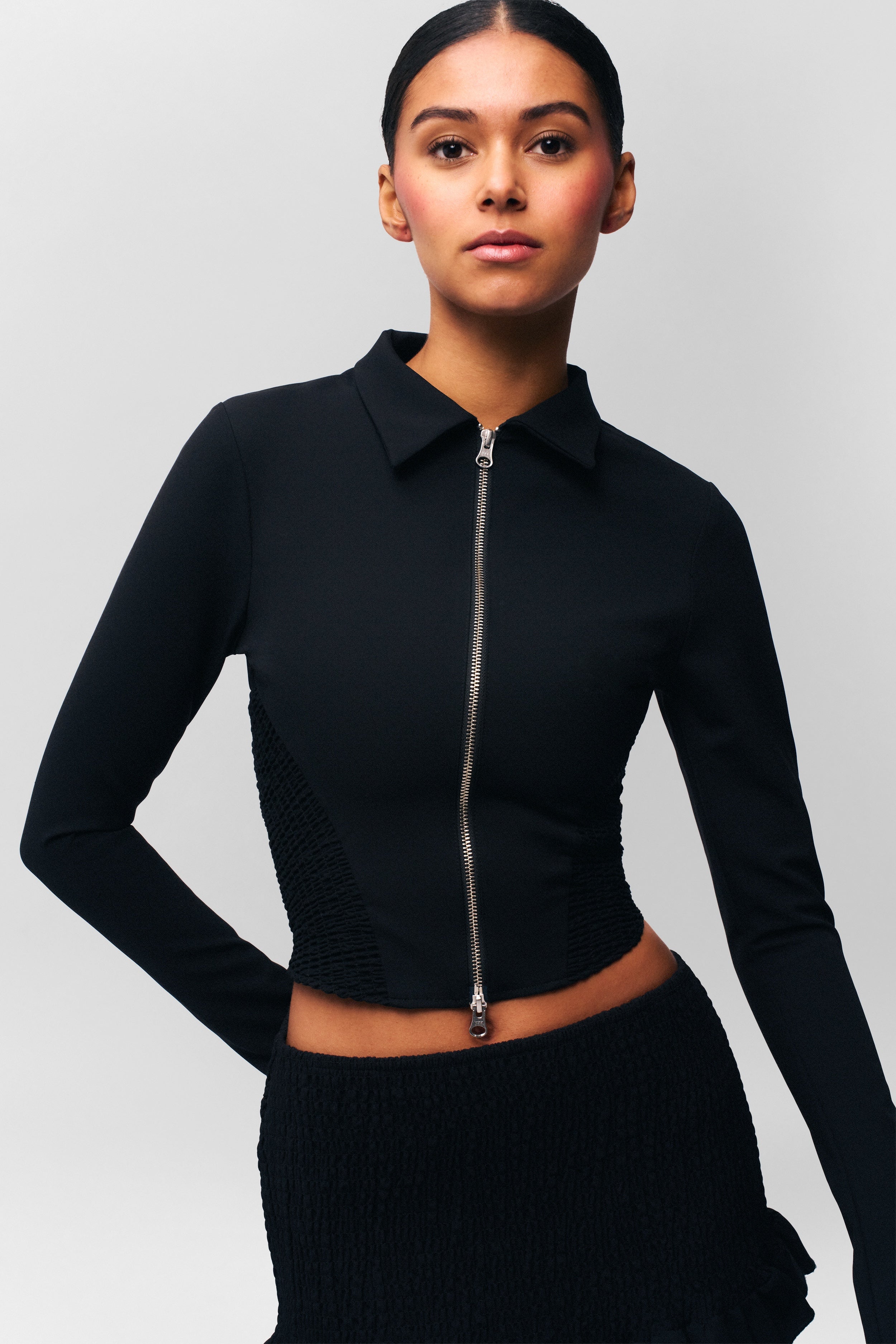 - Comfy and chic smocked jacket with a zip-up closure. The side smocking detail hugs the waistline just right for the perfect snatch.