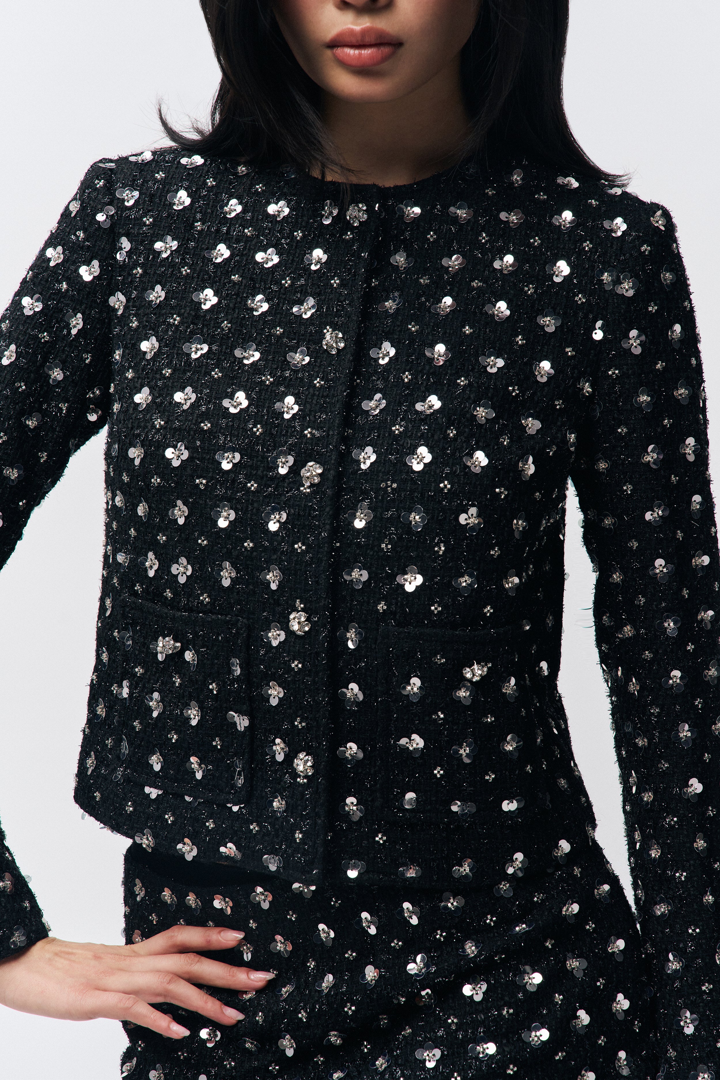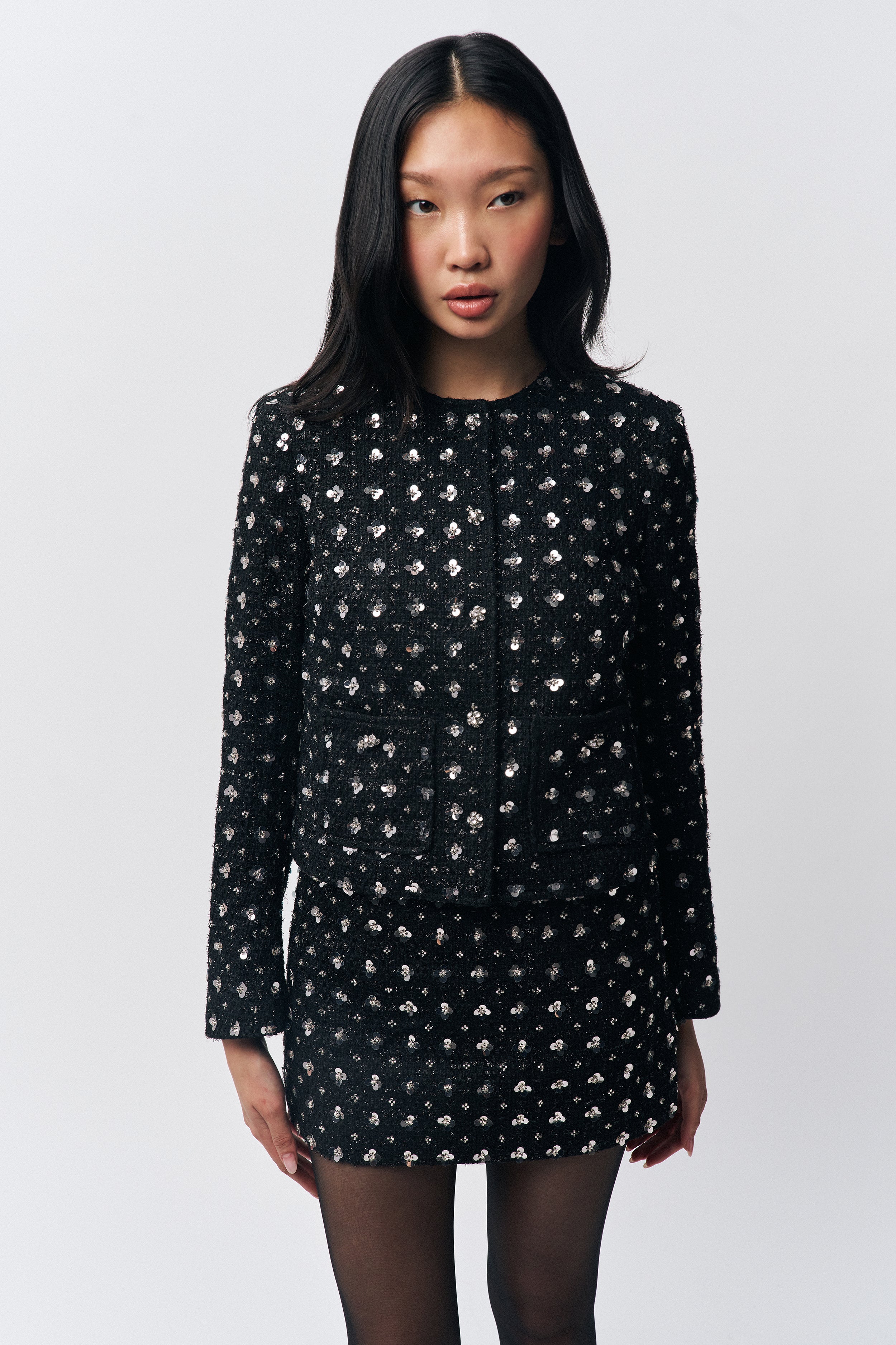 - The Wren Jacket is a chic cropped piece made from our luxurious bi-color tweed fabric. Its boxy shape adds a touch of elegance, making it perfect for layering over dresses or pair with our Halstead Skirt.