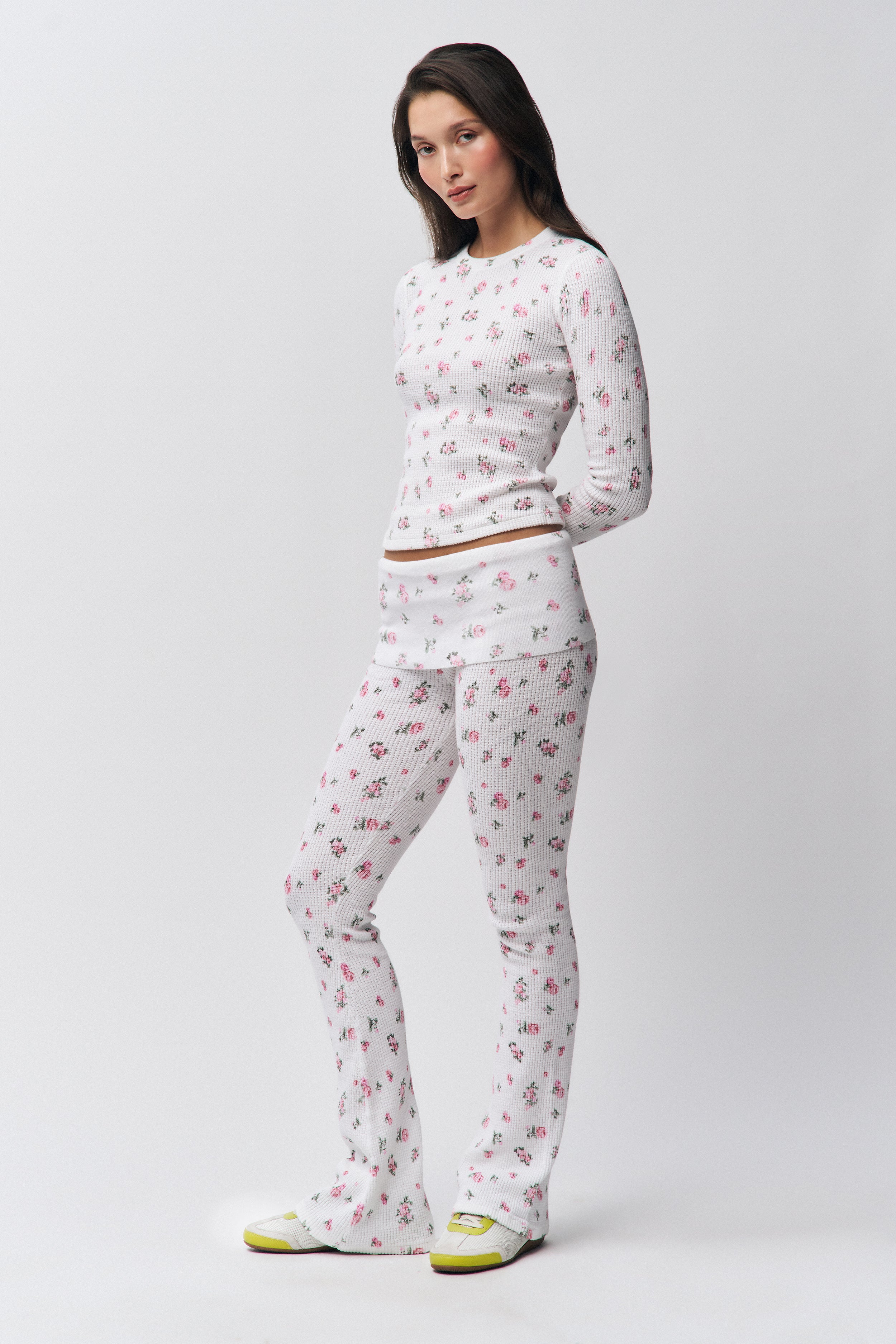 - Introducing the Flared Thermal Pants, designed for both comfort and style. Featuring a beautiful printed floral design on our cozy thermal fabric, these pants add a touch of femininity to your loungewear or casual outfits.