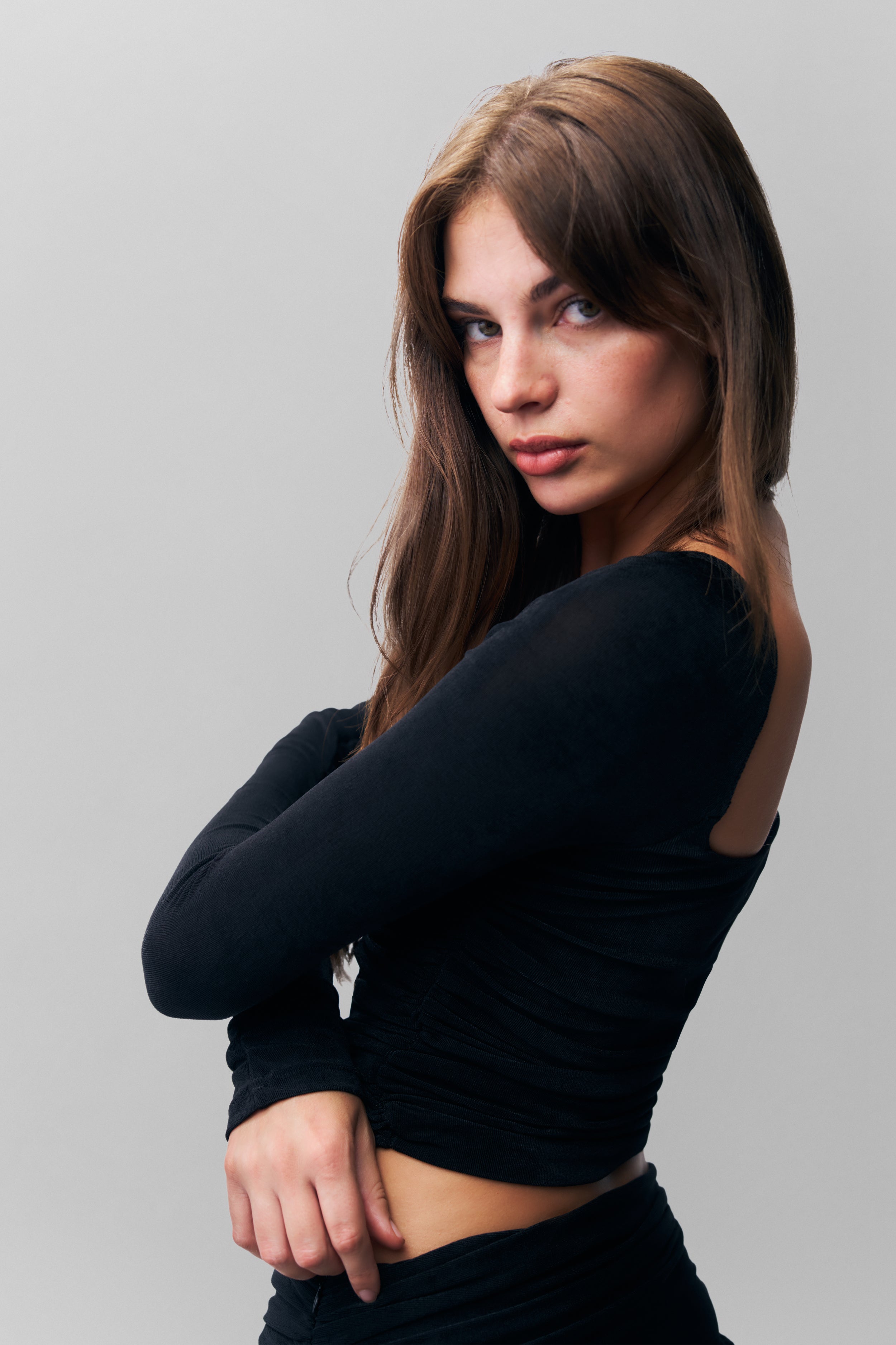 - Get ready to elevate your wardrobe with the Crisia Top! Made from our new spandex blend fabric, this top boasts an elegant sheen and features a flattering square neckline and ruching throughout. Perfect for effortlessly adding some style to any outfit.