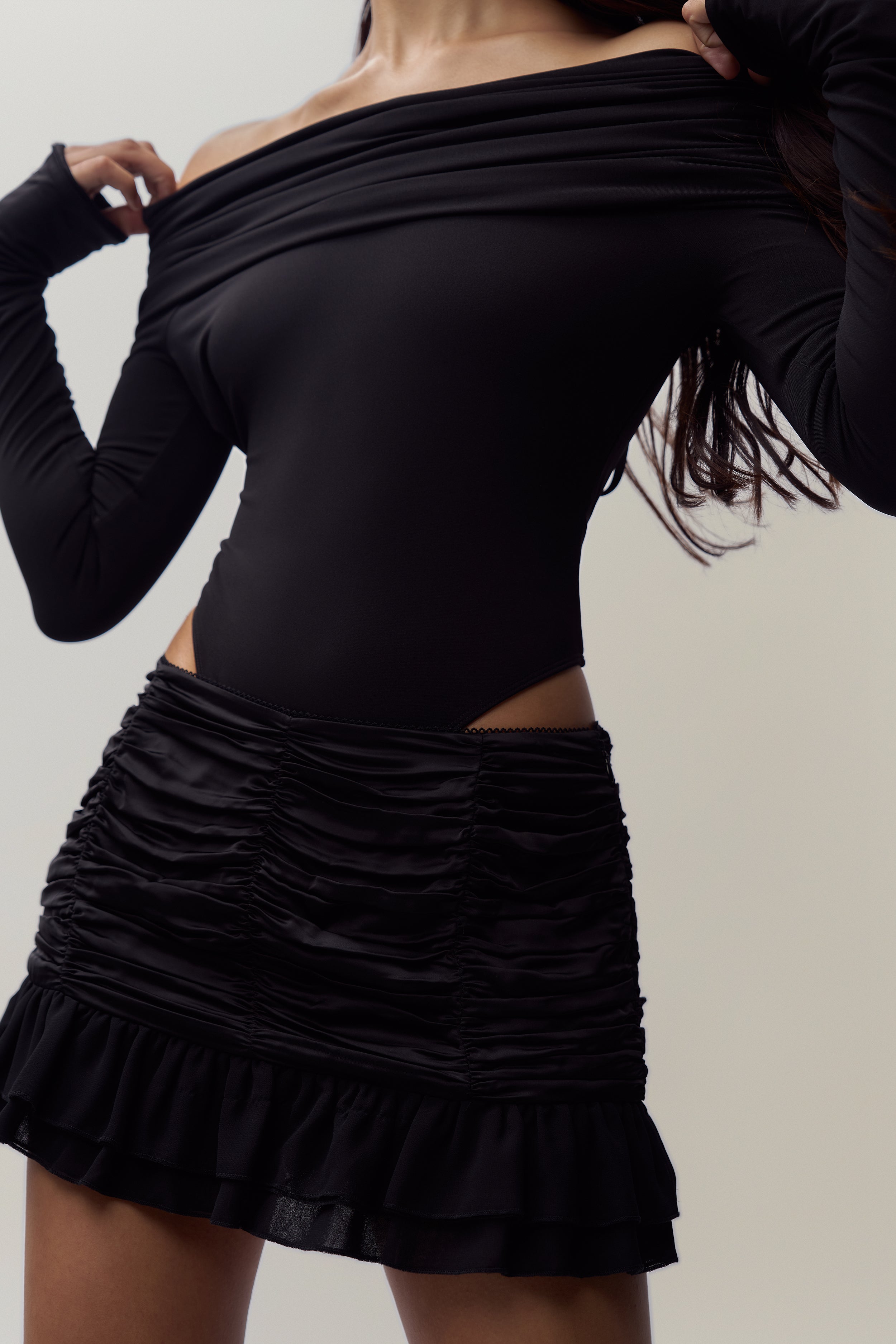 - Turn heads with the Lola Bodysuit, crafted from luxurious matte jersey for a sleek and sophisticated look. This stunning bodysuit features an open back design and an off-the-shoulder style, combining elegance with a modern edge. Perfect for pairing with skirts, pants, or shorts, the Lola Bodysuit offers versatile styling options for any occasion.