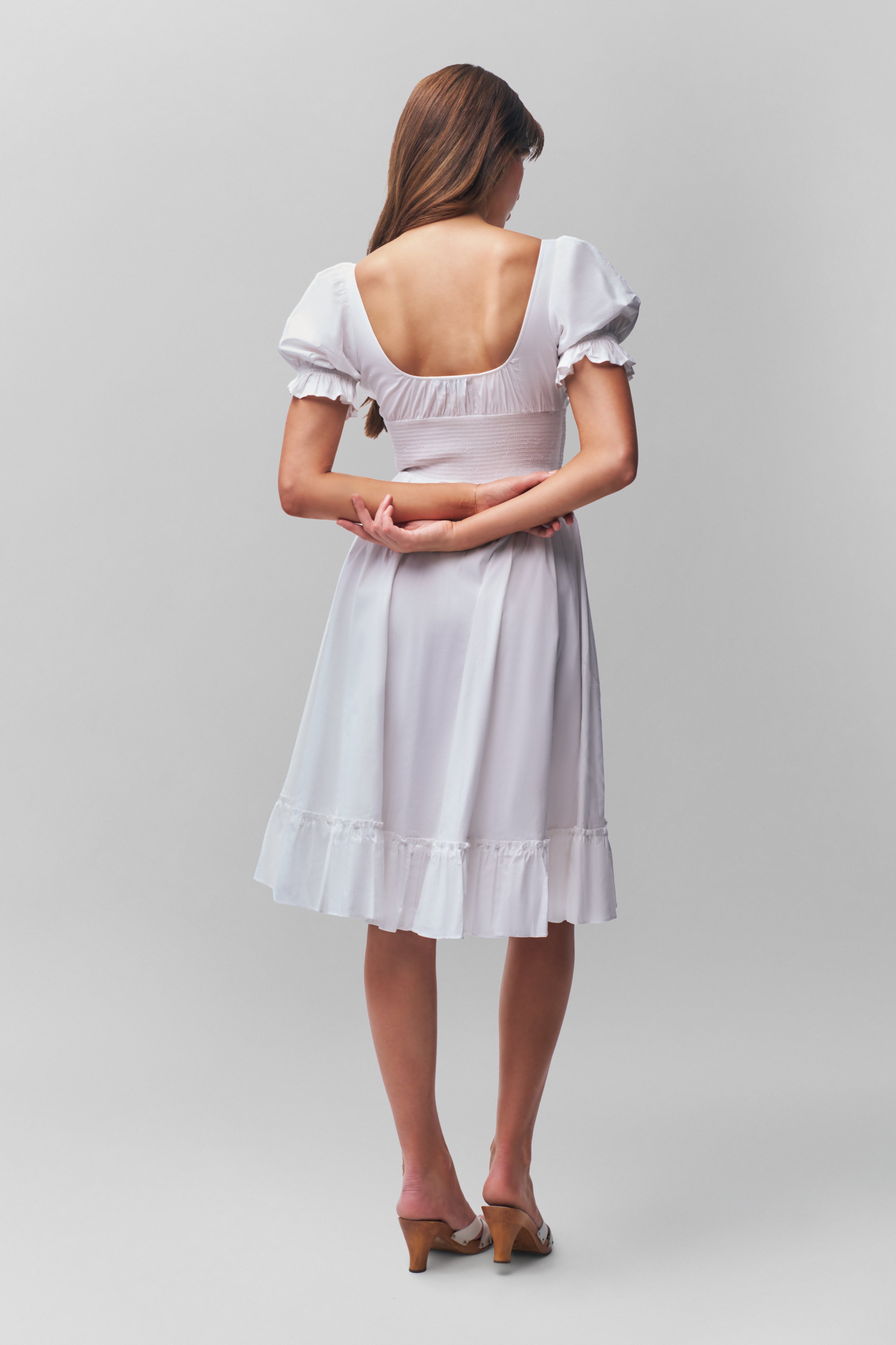 - Pull-on midi dress made of lightweight stretch poplin with puffed sleeves that are comfortably smocked and hidden pockets.