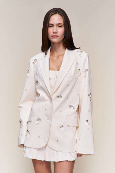 - Classic tailoring, reimagined with a statement finish. The Embellished Oversized Blazer is cut to a relaxed silhouette, designed with strong shoulders and a draped body for effortless layering. Covered in tonal floral appliqués and crystal beading, it delivers subtle sparkle with sculptural texture. Style it back with the matching Embellished Satin Corset for a statement set.